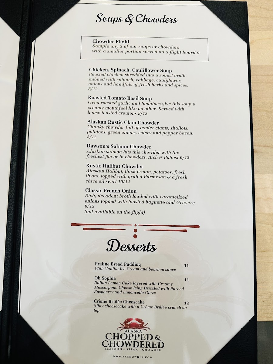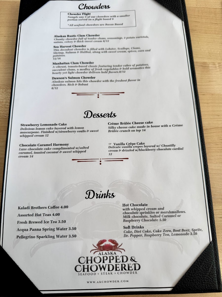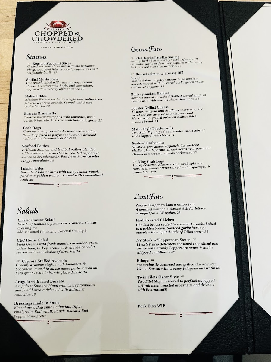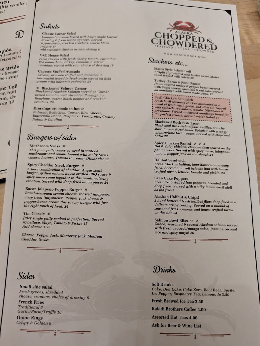 The menu at Alaska Chopped and Chowdered offers a comfortable blend of casual bites and hearty seafood dishes, ideal for a relaxed meal any time of day. Whether you’re stopping in for a light lunch or settling in for a satisfying dinner, the selections reflect the fresh, rich flavors of Alaska’s coastal ingredients in approachable, straightforward preparations.