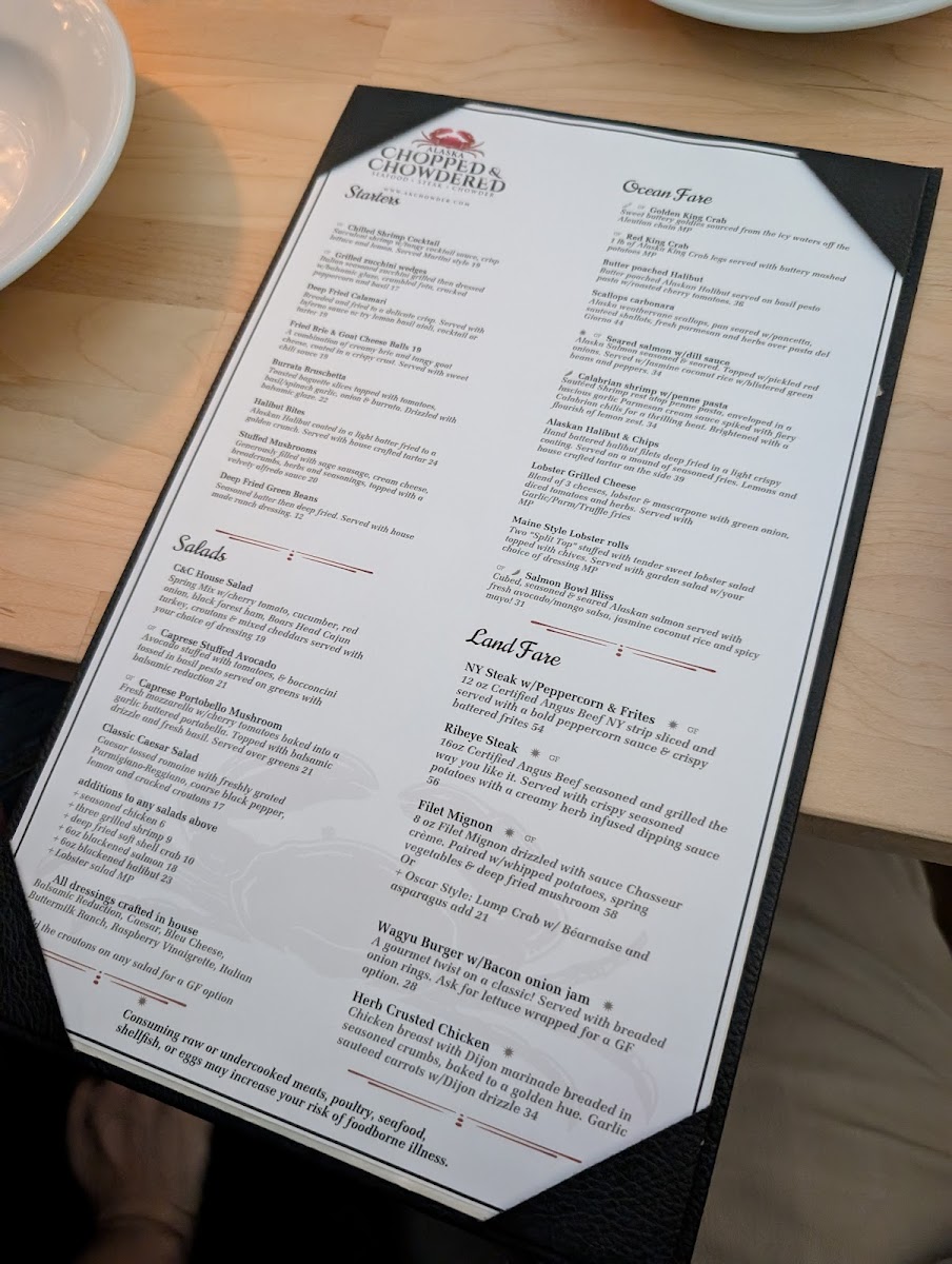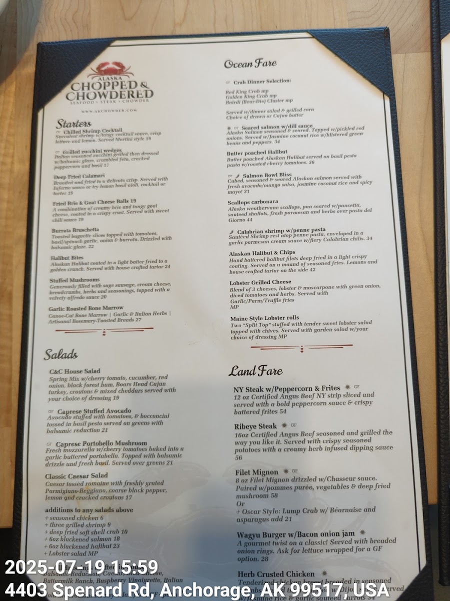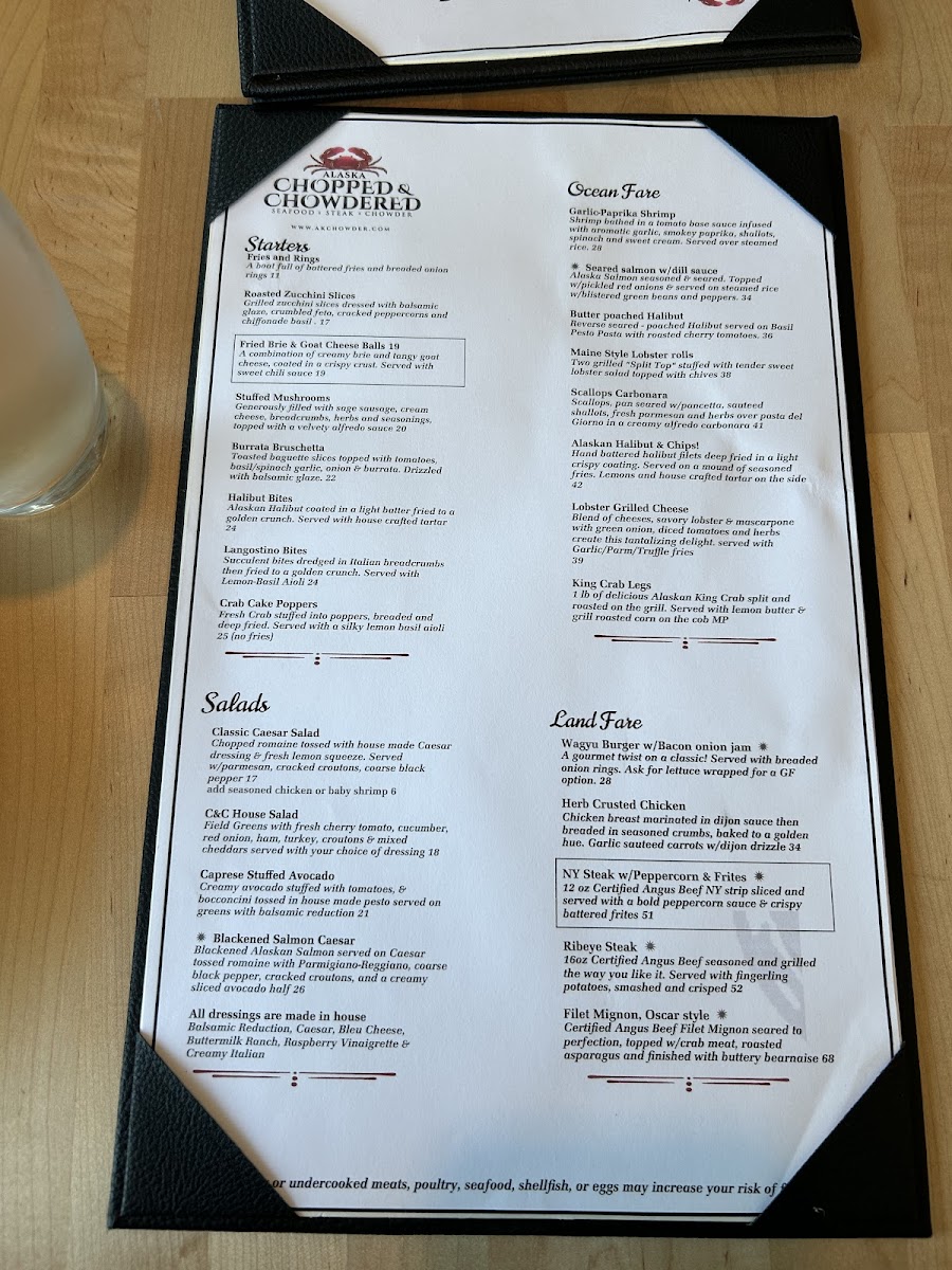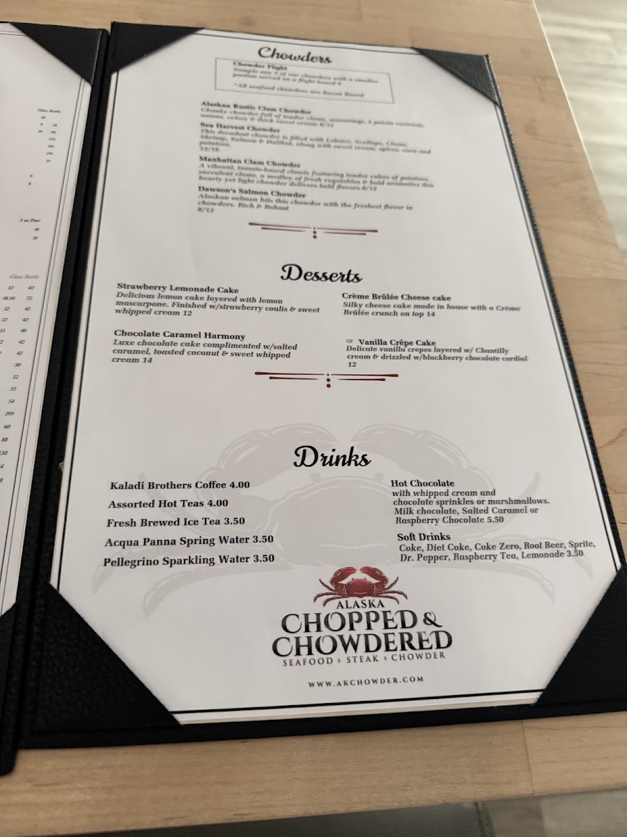 The menu at Alaska Chopped and Chowdered offers a comfortable blend of casual bites and hearty seafood dishes, ideal for a relaxed meal any time of day. Whether you’re stopping in for a light lunch or settling in for a satisfying dinner, the selections reflect the fresh, rich flavors of Alaska’s coastal ingredients in approachable, straightforward preparations.